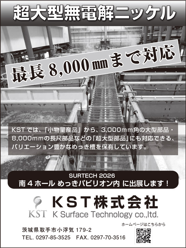 KST㈱ (本社工場:〒300‐1531 茨城県取手市小浮気179‐2/TEL:0297‐85‐3525/FAX:0297‐70‐3516)は2026年1月28日から東京ビッグサイトで開催される「SURTECH2026」(南4ホール めっきパビリオン内)に出展する。