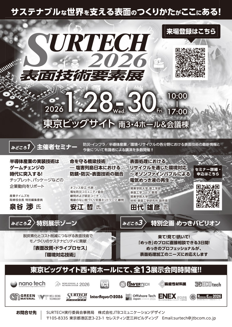 SURTECH 2026は、表面技術に特化した展示会で、環境負荷軽減や脱炭素化に貢献する最新技術が集結。関連12展示会と同時開催で2025年1月28日(水)〜30日(金)の3日間、東京ビッグサイトで開催される。同展示会に表面処理関連業界から出展する注目の企業を紹介する。