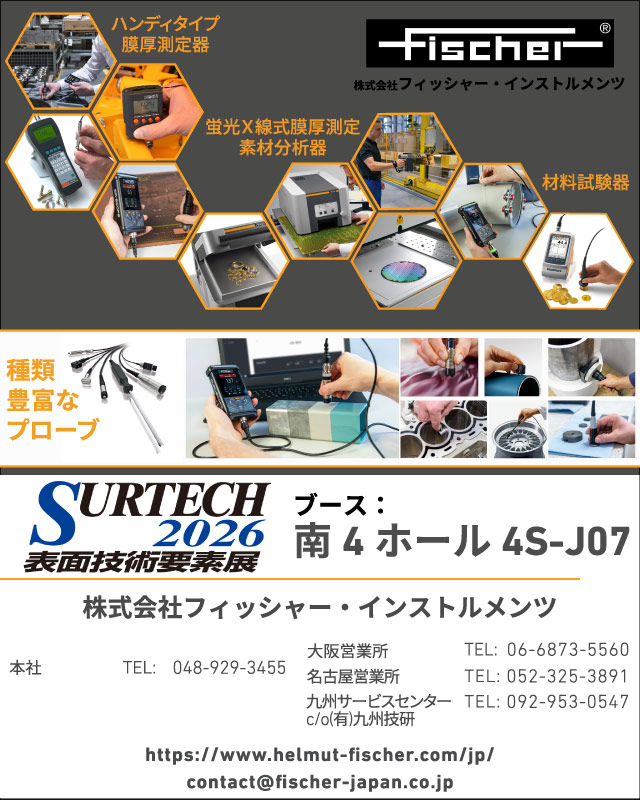 ㈱フィッシャー・インストルメンツ(埼玉県草加市神明1‐9‐16/安田光春社長/048‐929‐3455)は、膜厚測定・素材分析・微小硬さ試験・材料試験における測定装置を提供する専門メーカー。種類豊富に取り揃えているハンディタイプの膜厚計は、鉄や非鉄金属上の皮膜測定に適しており、様々な測定箇所に対応するプローブも種類豊富であるのも特徴。使い易い操作性が高く評価され、表面処理業界への導入が進んでいる。以下に今回のSURTECH2026に出展予定の製品の一部を紹介する。