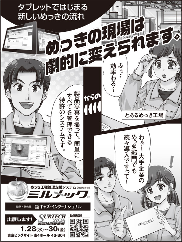 データベース設計・ソフトウェア開発等の販売・コンサルティング事業を行っている㈱キャズ・インターナショナル(川崎和彦代表取締役/東京都武蔵野市吉祥寺本町1‐32‐9モトハシビル)は、めっき加工に特化した唯一の工程管理支援ソフトで、受注/製造指示/検査/納品をタブレットで管理できる「画像追尾式めっき工程管理支援システム (ミルメックシリーズ)」を発表し、中小企業向けに販売を進めている。