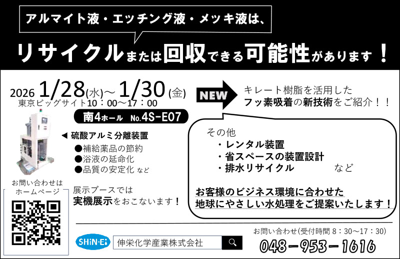 水処理装置の総合メーカーである伸栄化学産業㈱(埼玉県三郷市中央2-12-10/鈴木勝夫社長)では、2026年1月28日㈬から30日㈮まで、東京ビックサイト(南4ホール)で開催される「SURTECH2026」(ブース番号:4S-E07)に出展し、表面処理液の清澄化・延命化、金属回収システム、水洗水のリサイクルシステム、水処理装置のレンタル事業といったバラエティに富んだ展示を行う。